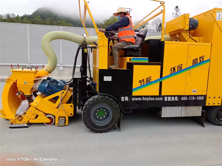 駕駛式路面拋丸機通過機械的方法把丸料(鋼丸或砂粒)以很高的速度和一定的角度拋射到工作表面上,讓丸料沖擊工作表面,以達到被拋射的表面粗化并去除殘留物的效果,與此同時除塵器產生的負壓會將丸料和清理下來的雜質粉塵等回收經過氣流清洗后,完好的丸料會自動循環使用,而雜質和粉塵也會落入灰斗中